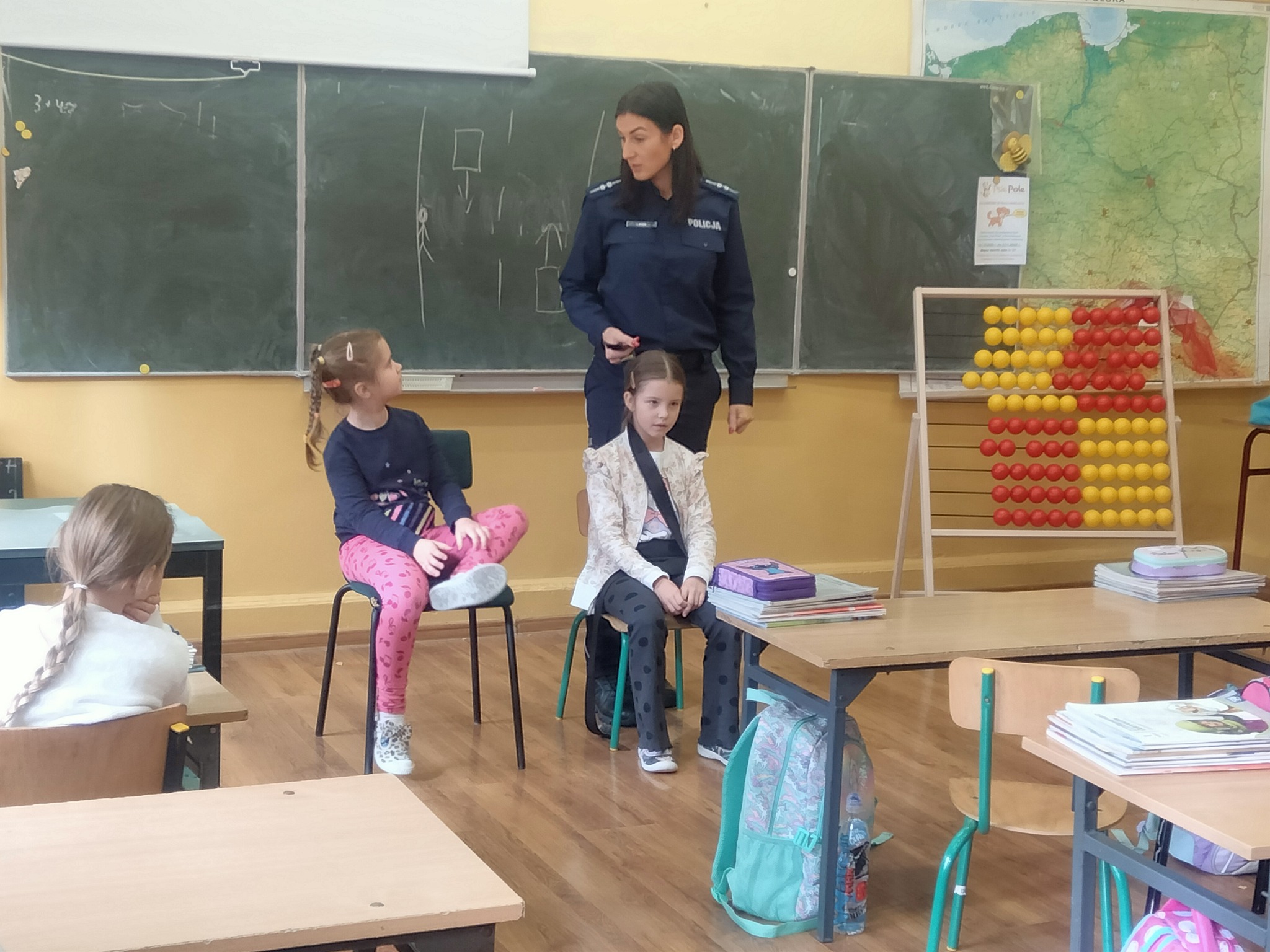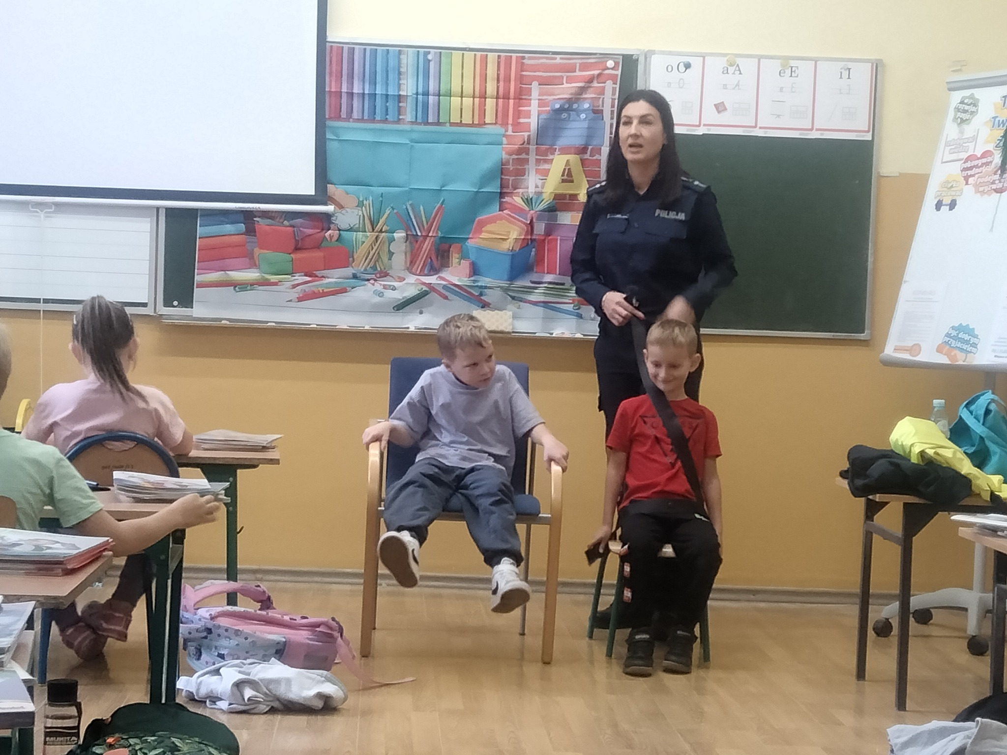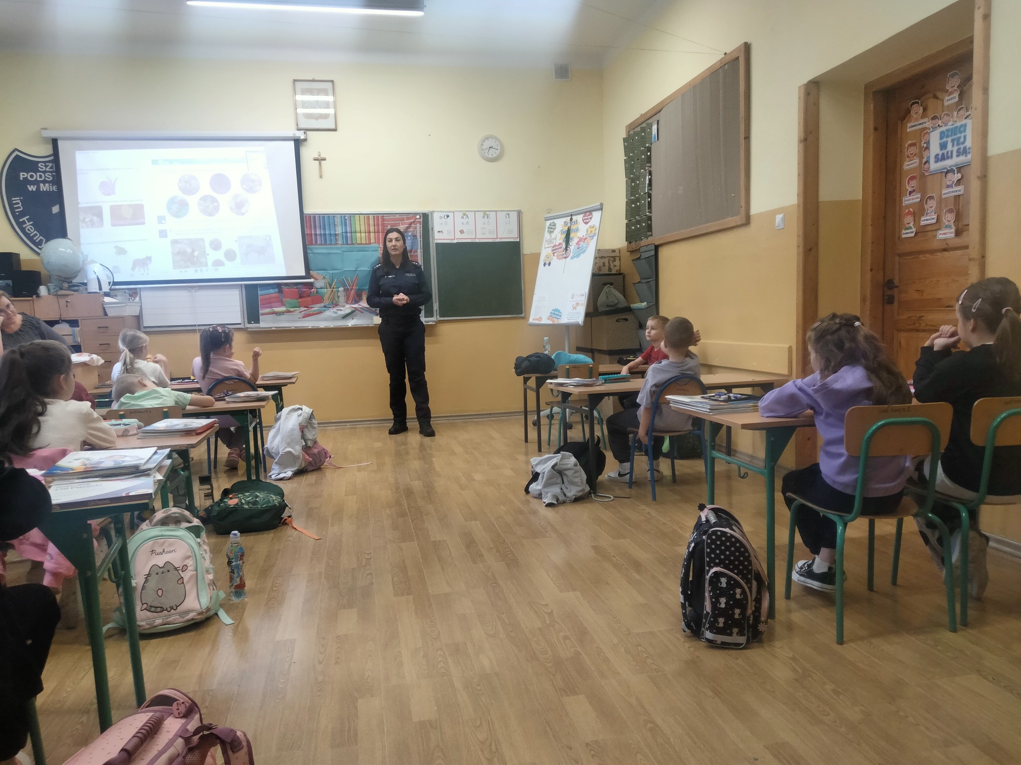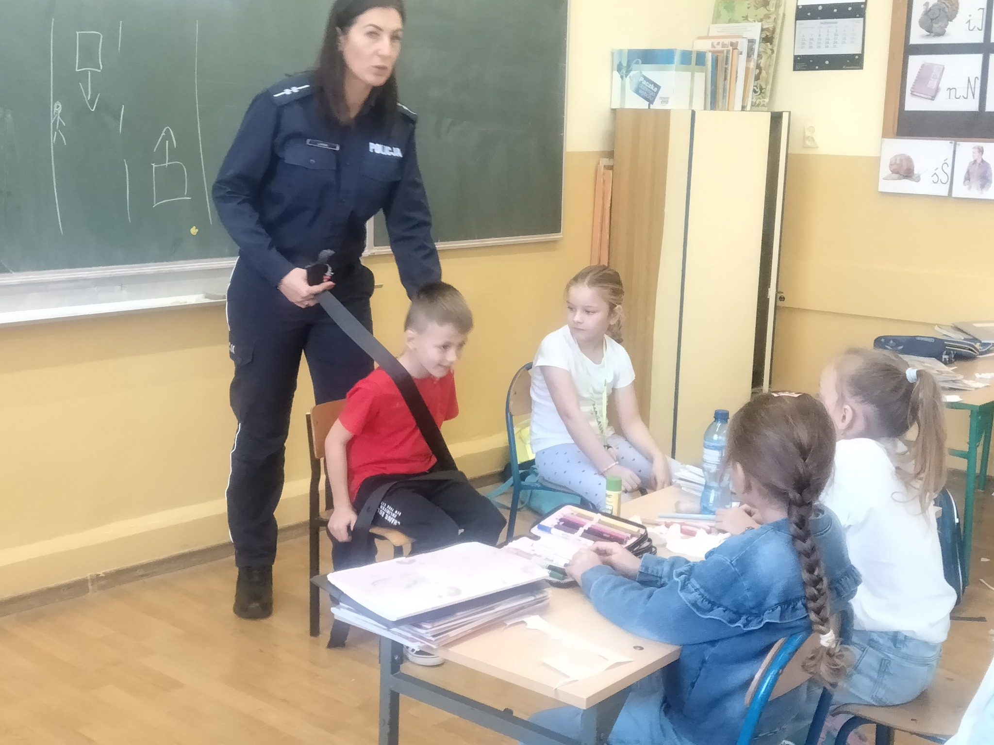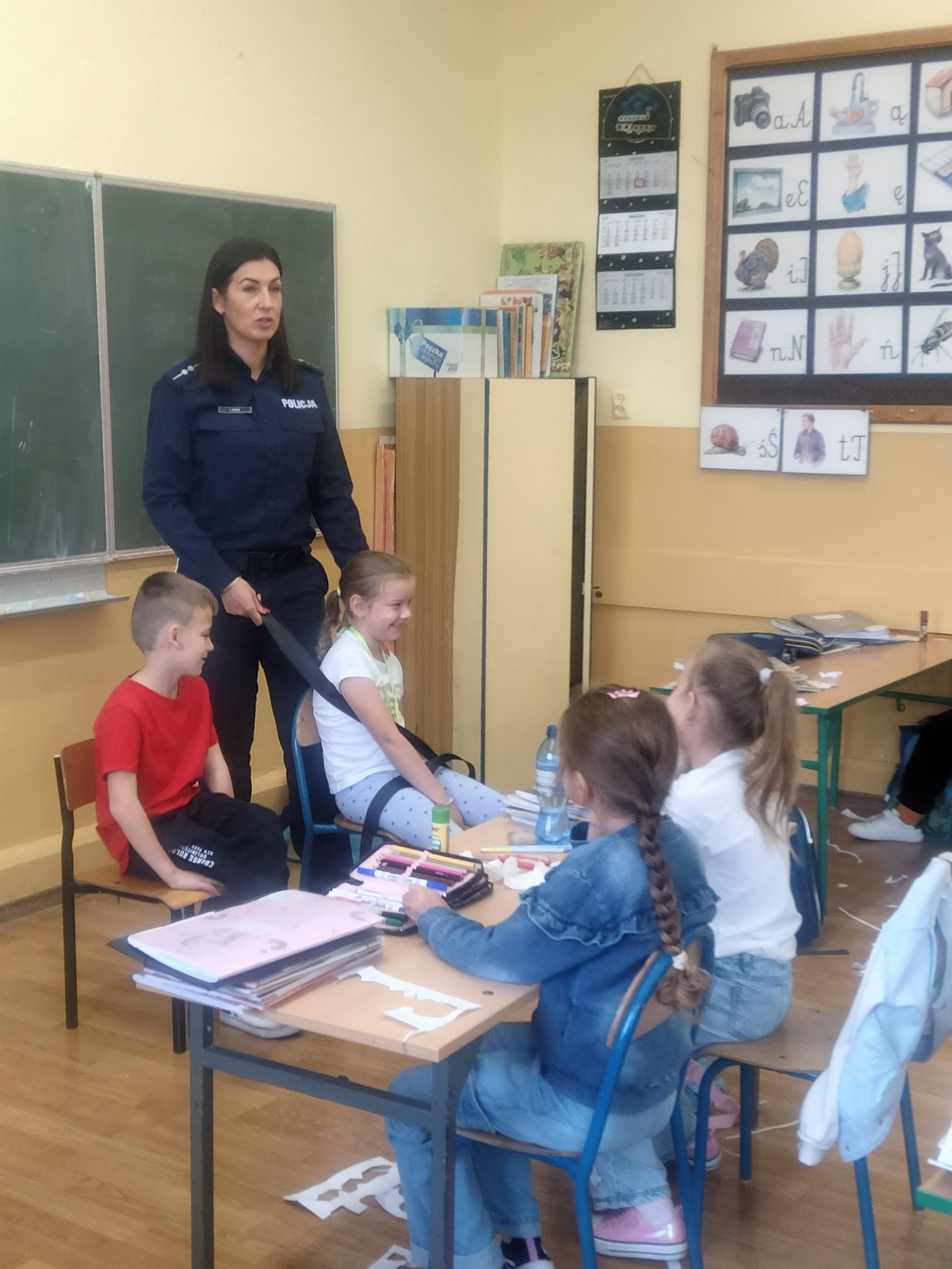 W dniu 15.10.2025r. w klasach 1 a, b, c odbyły się spotkania z asp. Lidią Kyzioł z Komendy Powiatowej Policji w Miechowie. W czasie spotkań uczniowie dowiedzieli się jak prawidłowo poruszać się po drodze, jak zadbać o bezpieczeństwo w czasie jazdy samochodem oraz dlaczego prawidłowe zapięcie pasów jest takie ważne. Na koniec spotkania Pani aspirant wskazała na konsekwencje nadmiernego korzystania z telefonów i gier komputerowych. Dzieci chętnie i z zaangażowaniem brały udział w zajęciach.