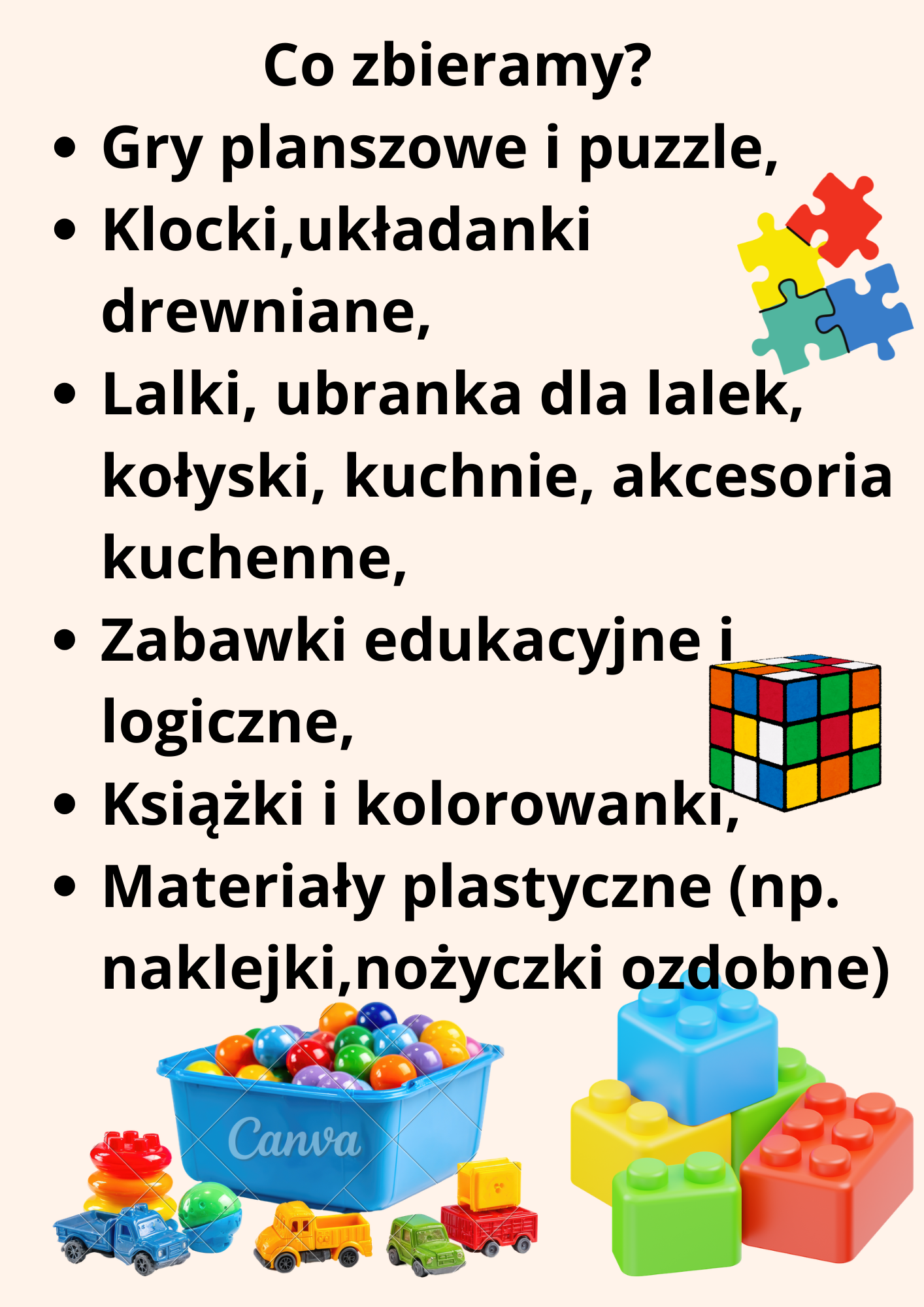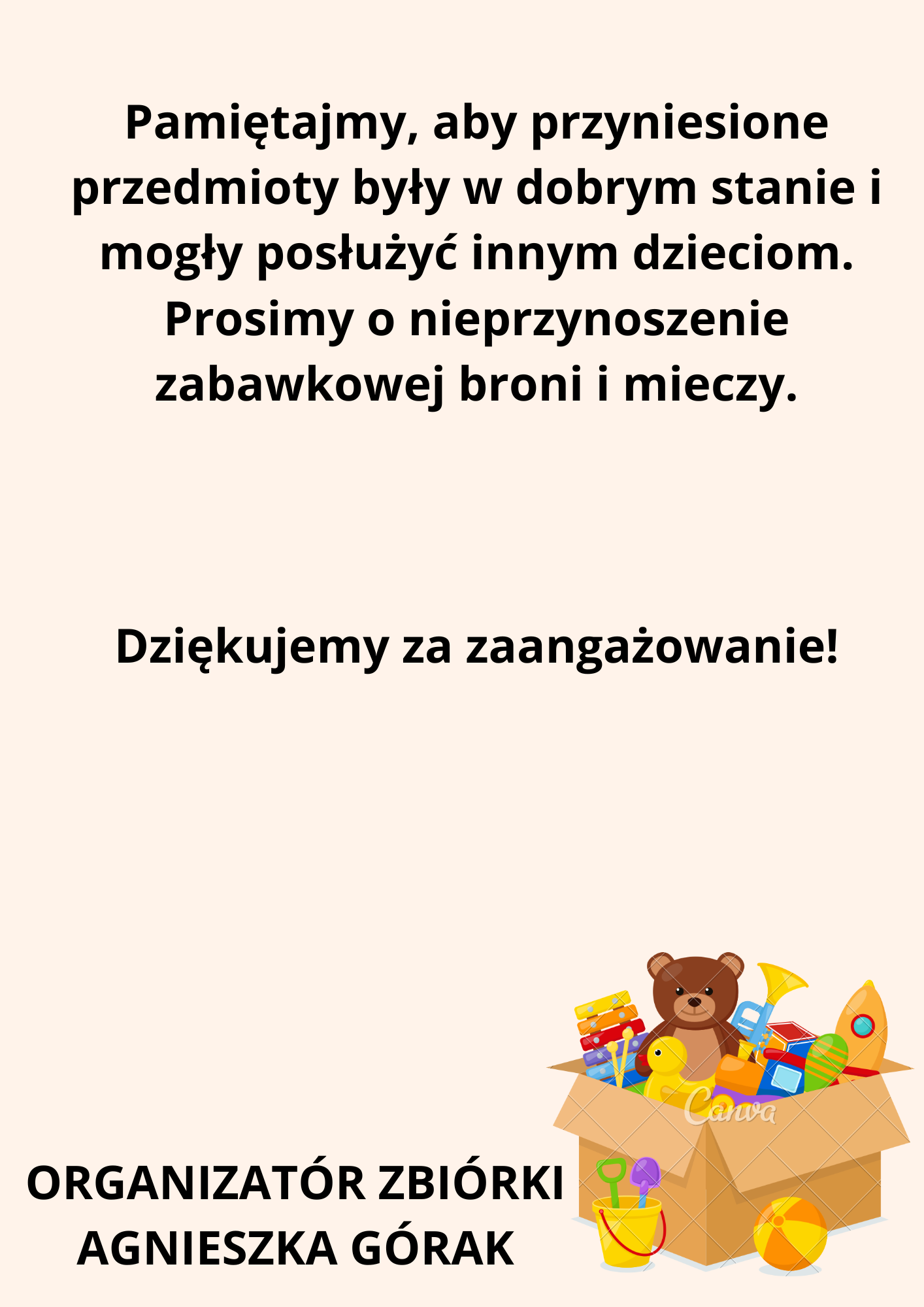 - Pamiętajmy, aby przyniesione przedmioty były w dobrym stanie i mogły posłużyć innym dzieciom. Prosimy o nieprzynoszenie zabawkowej broni i mieczy.