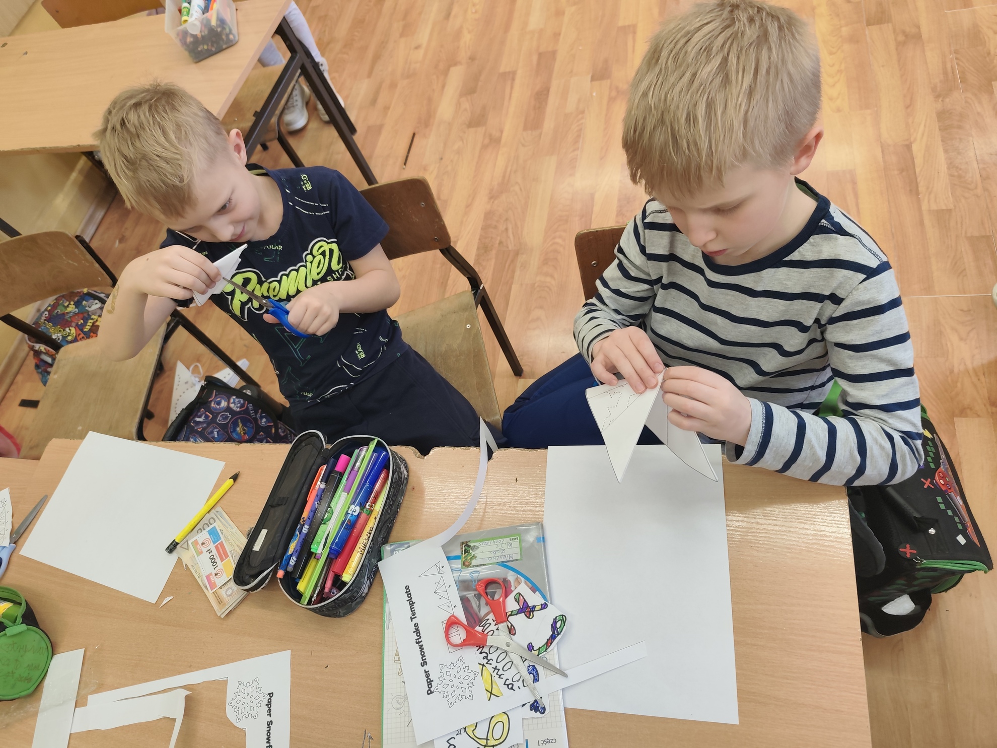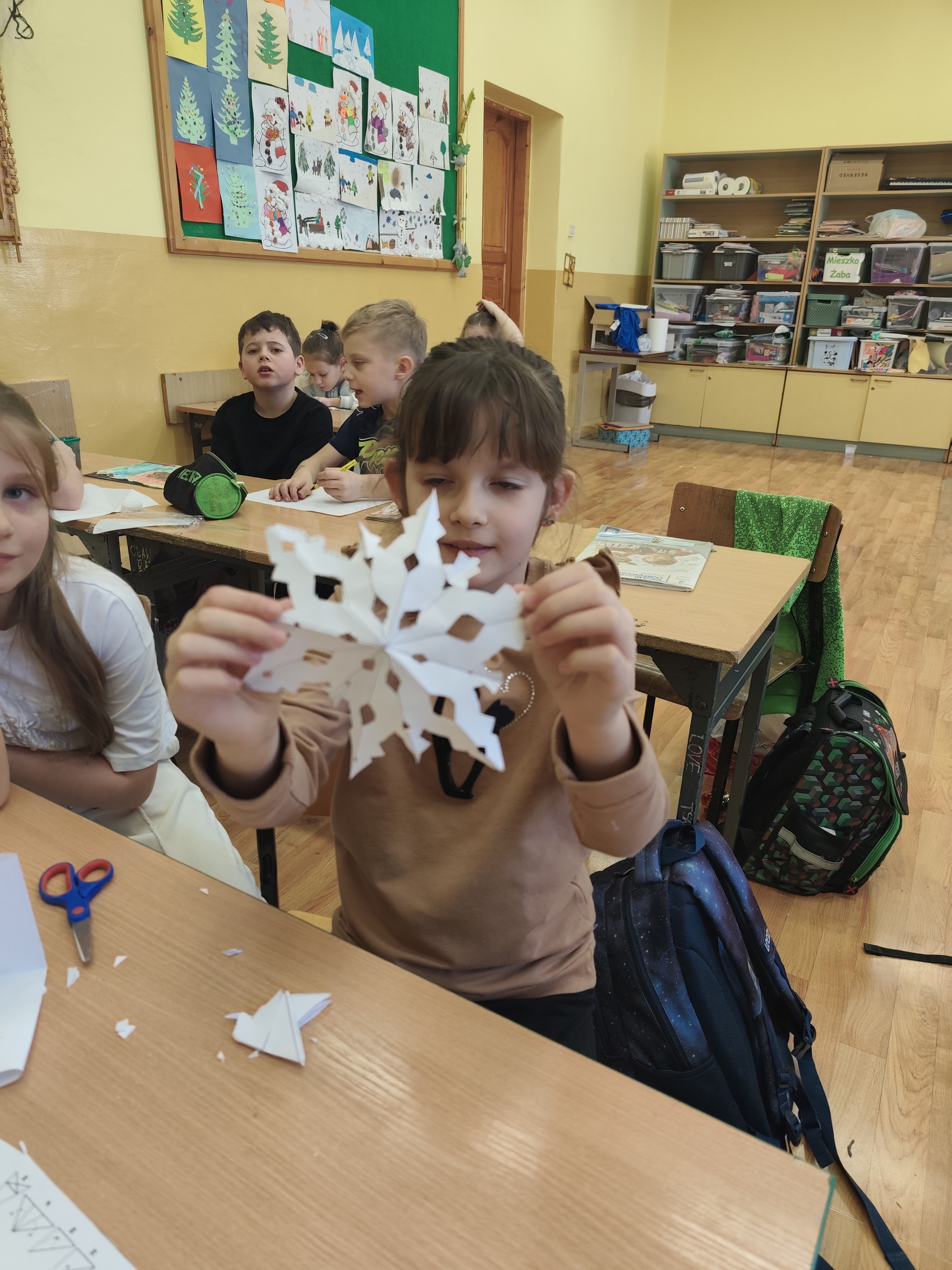 Dzień śniegu na świetlicy szkolnej. Z okazji dnia śniegu dzieci podczas zajęć świetlicowych wykonały płatki śniegu z papieru oraz pracę plastyczną z użyciem świecy i farb akwarelowych.
